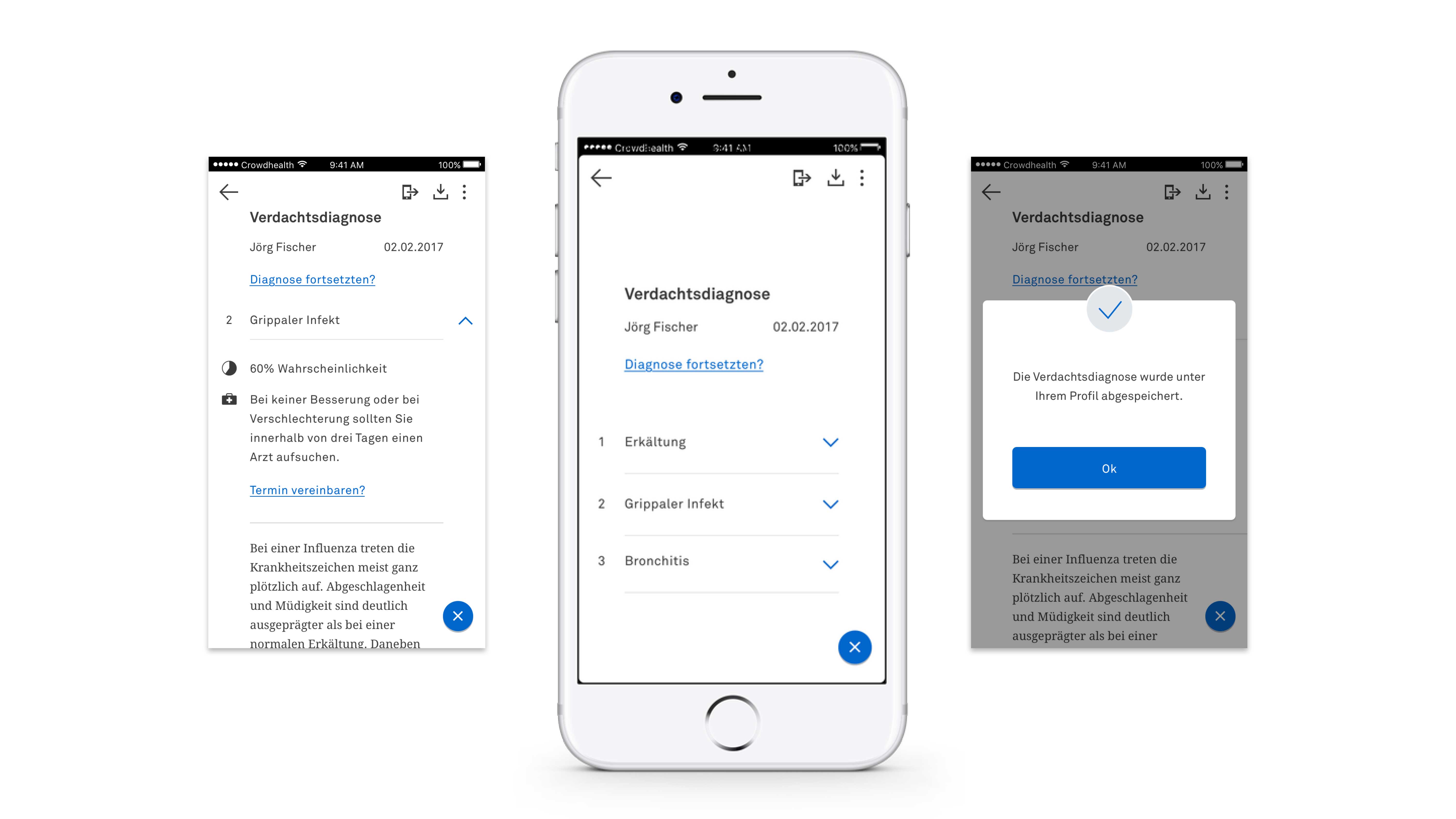 Die Applikation bietet drei Verdachtsdiagnosen zu den Angaben des Patienten an und kategorisiert diese nach Wahrscheinlichkeit. Dem Patienten wird die Wahrscheinlichkeit dieser Diagnose und eine Empfehlung, wann er einen Arzt aufsuchen sollte, aufgezeigt. Außerdem hat der Patient bei schwerwiegenden Diagnosen sofort die Möglichkeit einen Arzttermin zu vereinbaren.