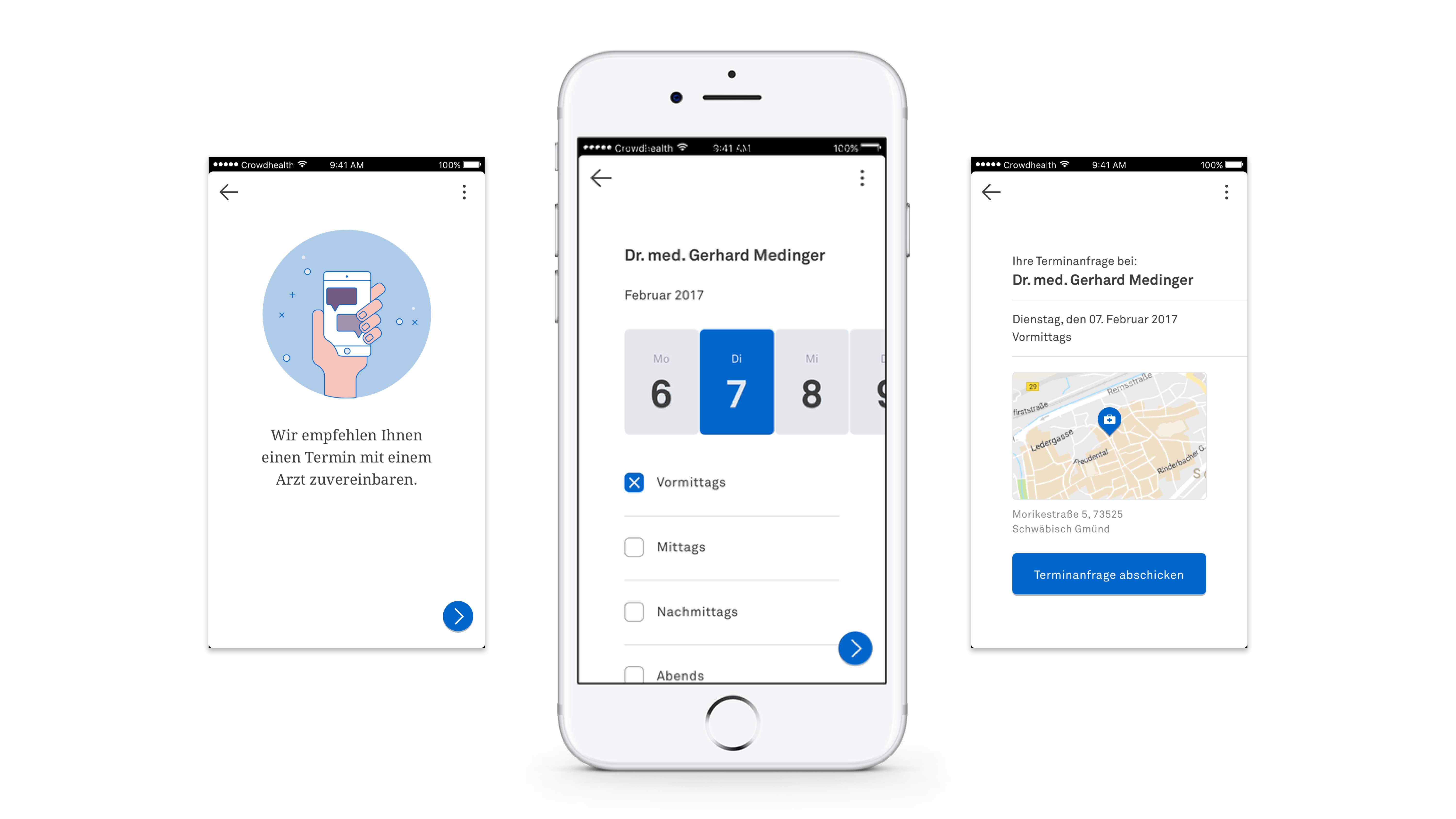 Der Patient verbucht einen Termin mit Ärzten, die sich in seiner Umgebung befinden. Er gibt dazu einen möglichen Zeitraum an und schickt diese Terminabfrage anschließend ab. Der Terminplaner zeigt dem Patienten Ärzte in seiner Umgebung an.