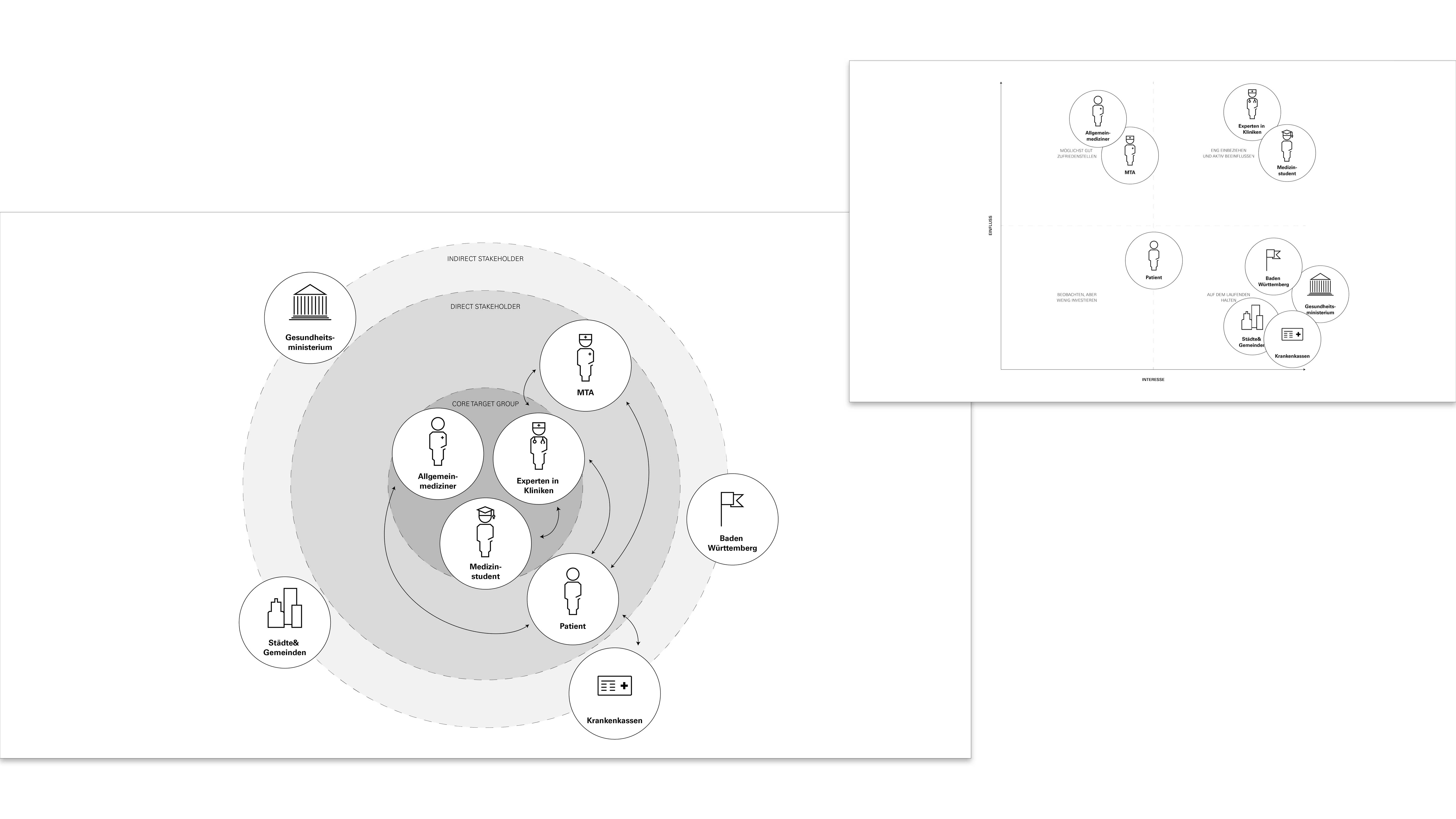 Bei der Erstellung der Stakeholder Map haben wir versucht alle Beteiligten, die am Ökosystem des Gesundheitssystems und der Einführung einer telemedizinischen Betreuung beteiligt sind, aufzulisten und in eine Hauptzielgruppe und eine direkte und indirekte Nutzergruppen aufzugliedern.