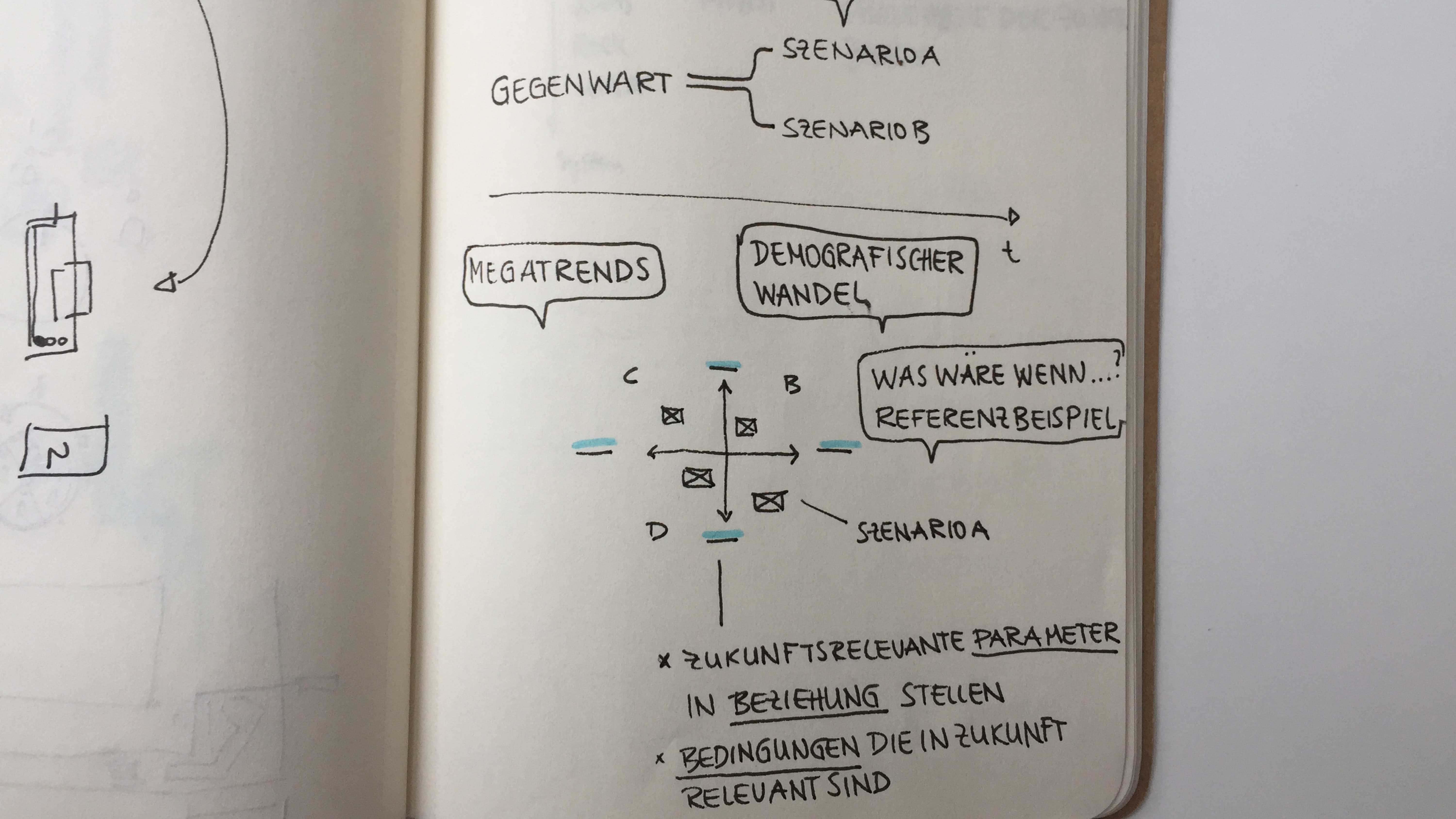 Innerhalb eines zweitägigen Workshops, haben wir versucht geeignete Szenarien für unser Projekt zu erstellen. Dabei haben wird versucht, dass Projekt in die Zukunft zu skalieren. Unter der Fragestellung »Was wäre wenn ...?«. Zu Beginn des Workshops haben wir uns mit den wichtigsten Faktoren beschäftigt, die unsere Fragestellung beeinflussen. Unsere Fragestellung beschäftigt sich mit der Schnittstelle zwischen dem Menschen und der Gesundheit. Abschließend zum Szenario-Workshop haben wir uns für zwei Szenarien entschieden. Einerseits, das Szenario mit dem Titel »Take Healthcare into Your Own Hands« und andererseits, das Szenario »Sharing Healthcare-Data«.