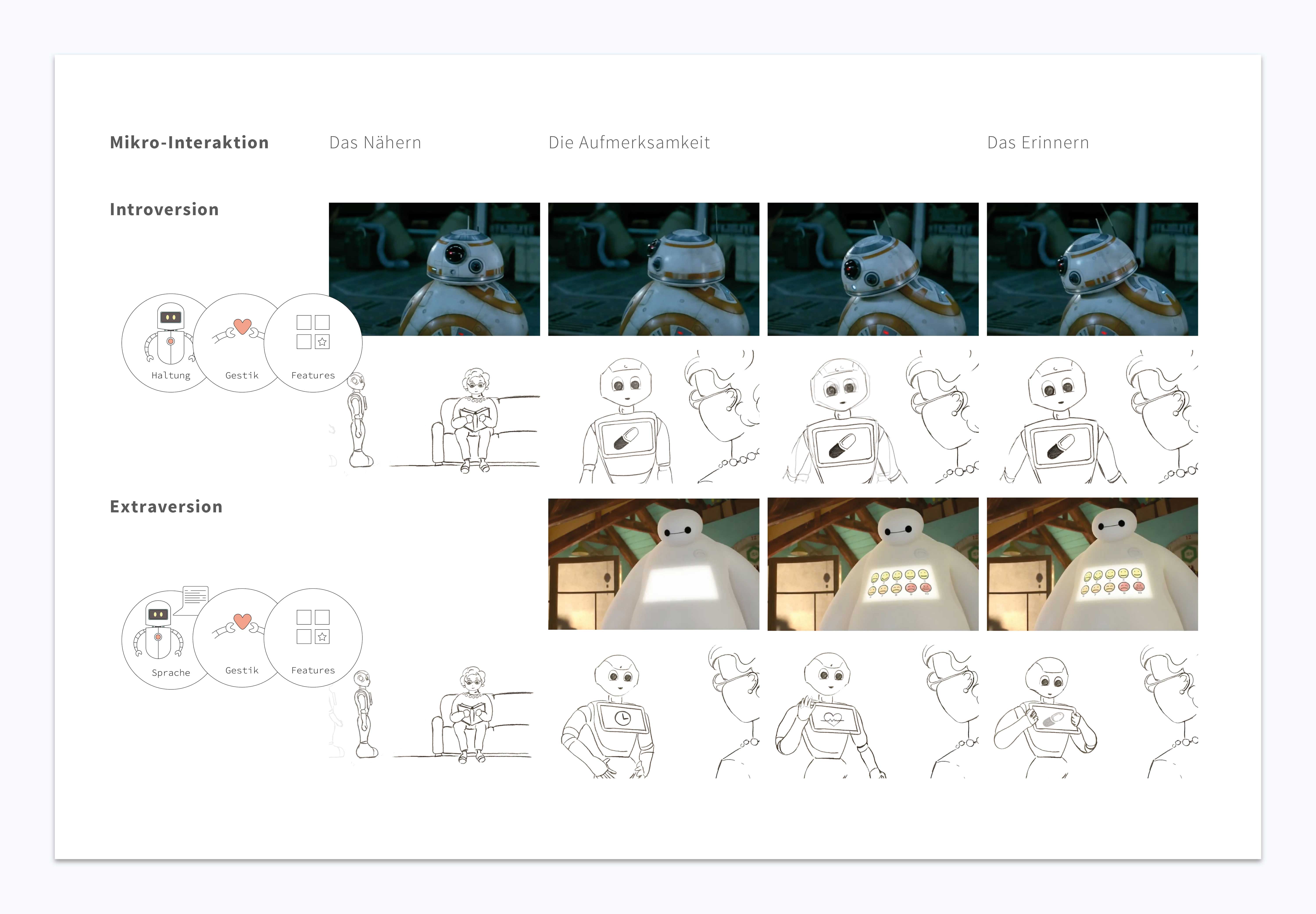 Die »Essential Interaction« des Erinnerns. Im Beispiel soll »Pepper« auf die Medikamenteneinnahme aufmerksam machen. Die Varianten unterscheiden sich in einem introvertierten und einem extrovertierten Verhalten. Die Interaktion wurde von »Baymax« und »BB8« adaptiert.