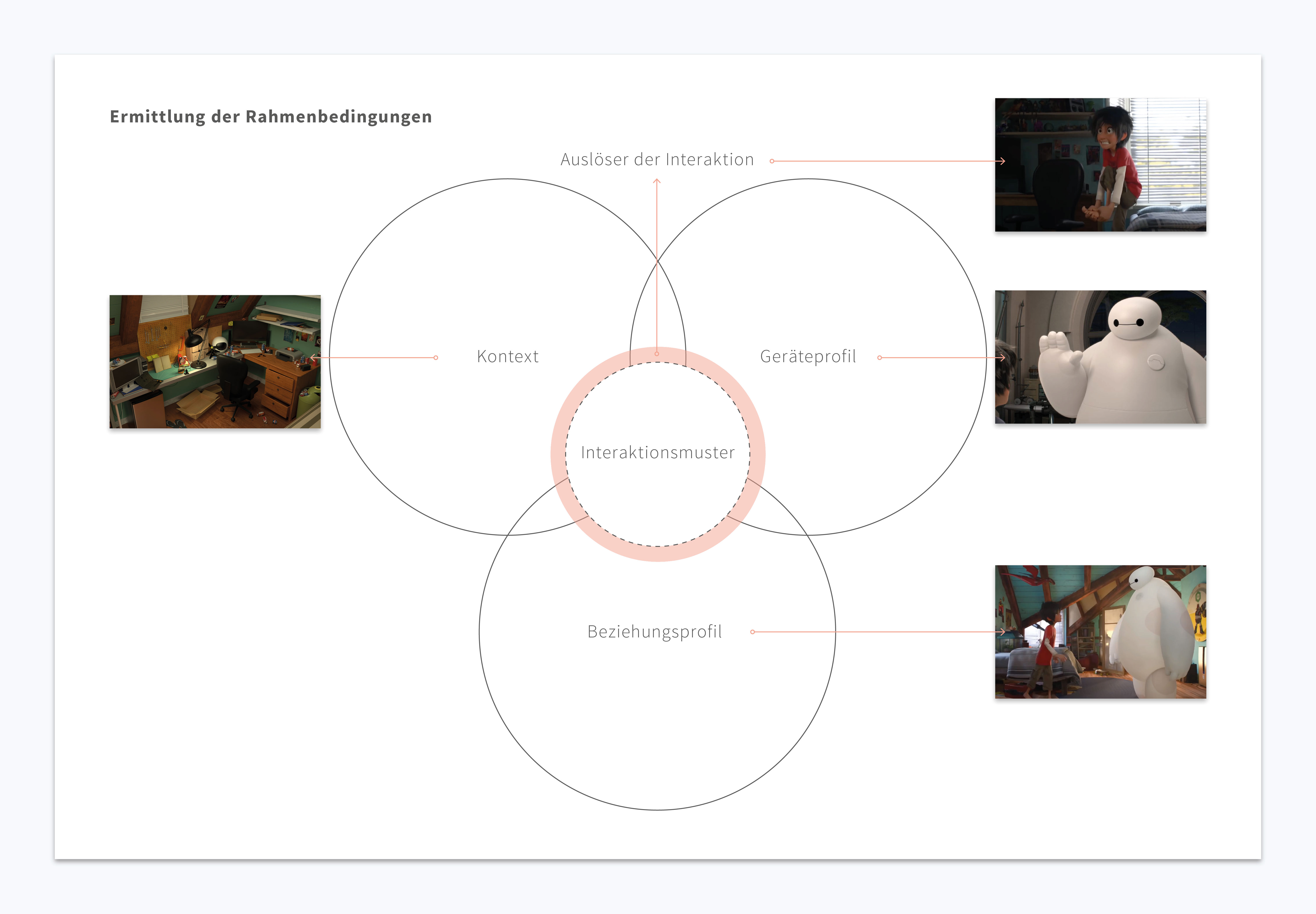 Die Grundlage bildet der Kontext, also in welcher Umgebung befindet sich der Roboter. Das Geräteprofil bestimmt die Modalitäten des Roboters, im Beispiel gehört »Baymax« der humanoiden Form an. Das Beziehungsprofil bestimmt wie lange sich Nutzer und Roboter bereits kennen und in welcher Beziehung die beiden zueinander stehen. Auf Basis der Rahmenbedingungen wird durch einen Auslöser, welcher im Kontext geschieht, ein generisches Interaktionsmuster beim Roboter ausgelöst.