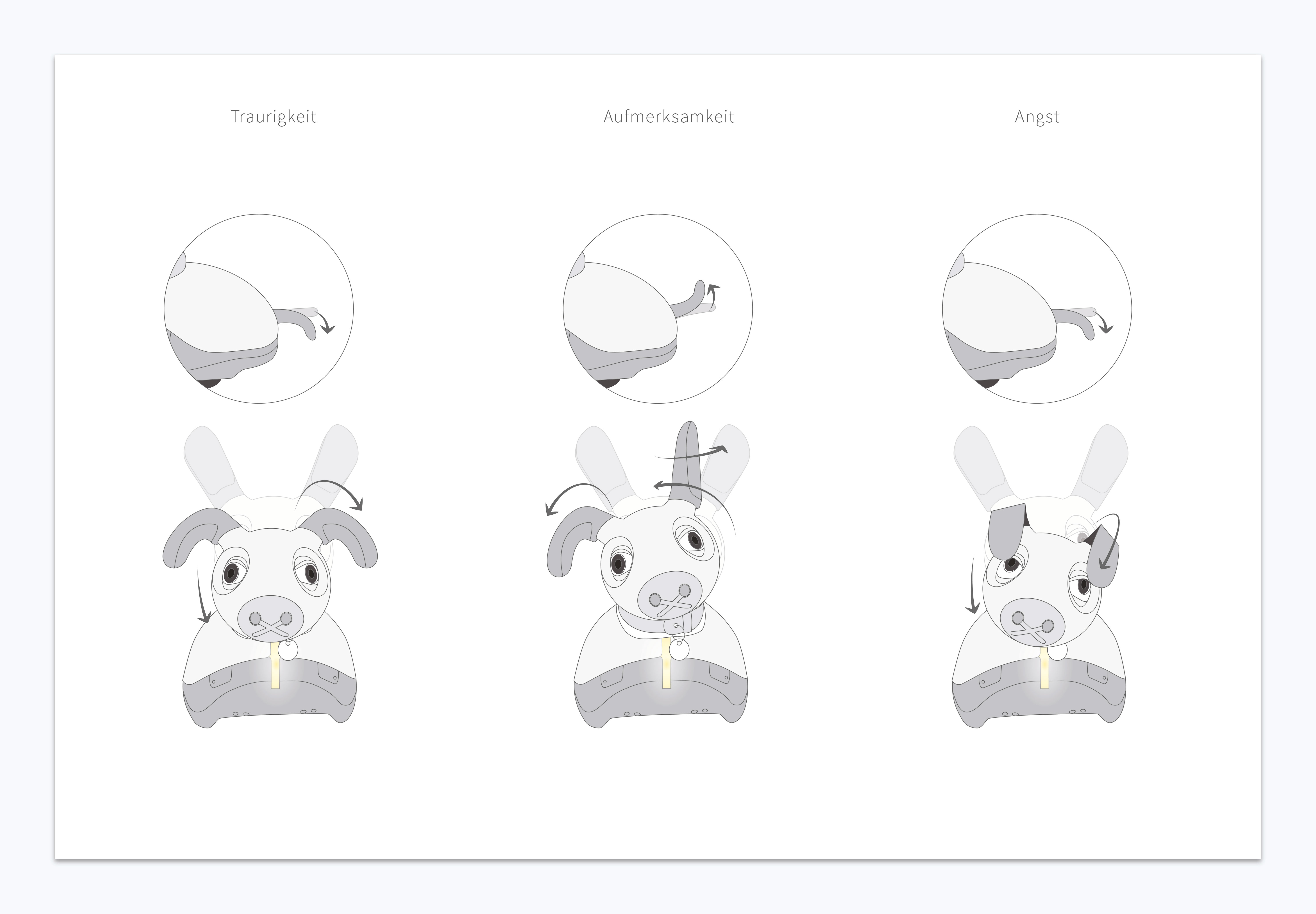 Auch bei »MiRo« wurden verschiedene Gemütszustände visualisiert. Da das Developer Kit keine validierten Design Patterns zur Verfügung stellt, mussten auch hier Emotionszustände unter Berücksichtigung der Bewegungsradien erprobt werden.