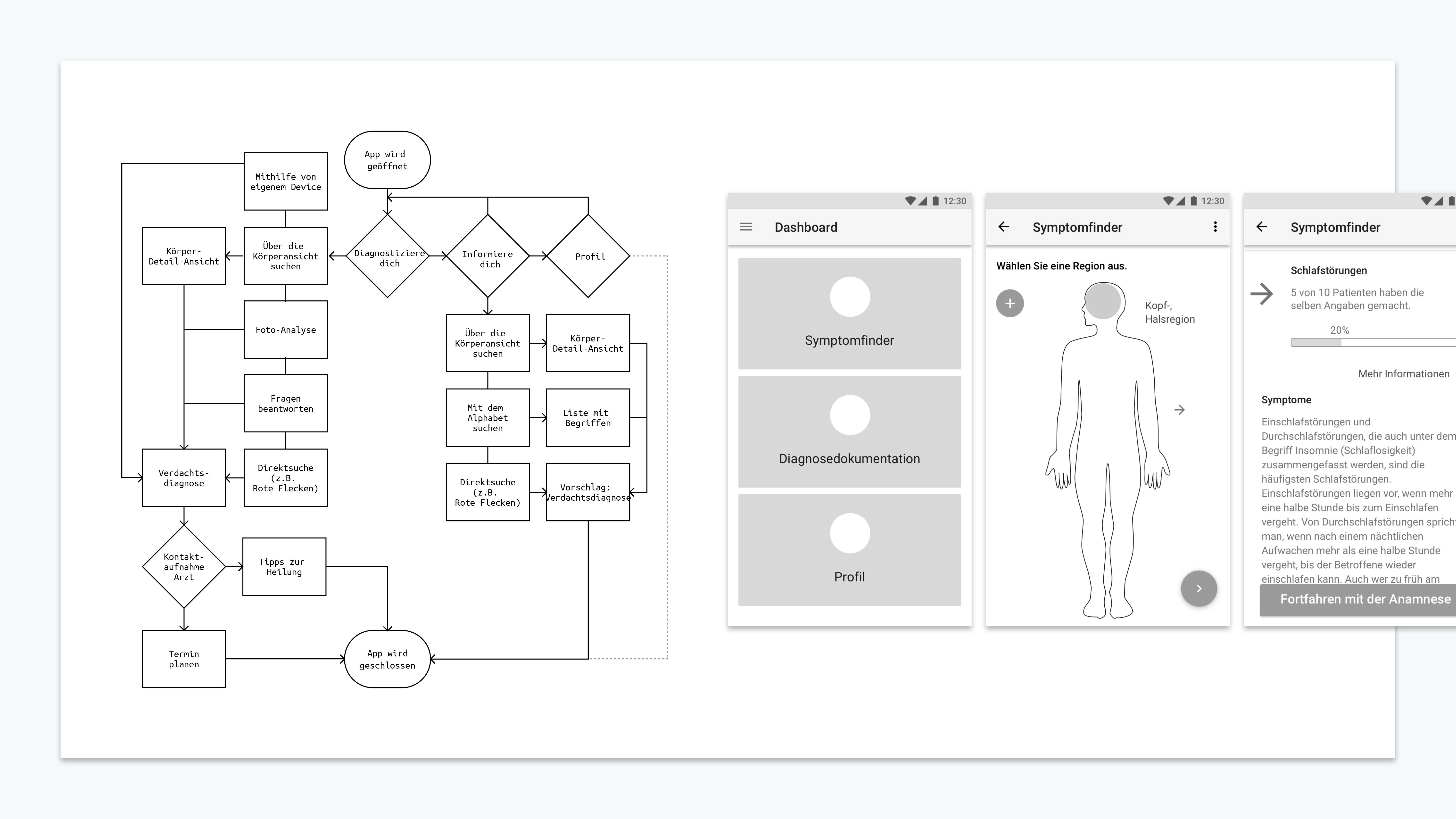 Mittels einer Flowchart haben wir versucht unsere zwei Use Cases in einzelnen Schritten abzubilden. Die Applikation unterteilt sich in drei Hauptbereiche, zum einen in die Selbstdiagnose und zum anderen in den Informationsbereich über eine bestehende Erkrankung. Das Profil dient als digitale Patientenakte des Patienten. Müsste der Patient im Falle eines Arztwechsels, da der betreuende Hausarzt in den Ruhestand geht, einen neuen Arzt aufsuchen, könnte er somit auf bereits gestellte Diagnose zugreifen. Im Bereich der Selbstdiagnose hätte der Patient die Möglichkeit nach einem Symptom nachzuschlagen und eine Verdachtsdiagnose zu erstellen. Bewusst wird ausschließlich nach Symptomen gesucht, da auf diese Weise eine Eingabe wie »Krebs« vermieden werden kann. Denn »Krebs« ist bereits eine Diagnose und kann nur durch den ärztlichen Kontakt bestätigt werden.