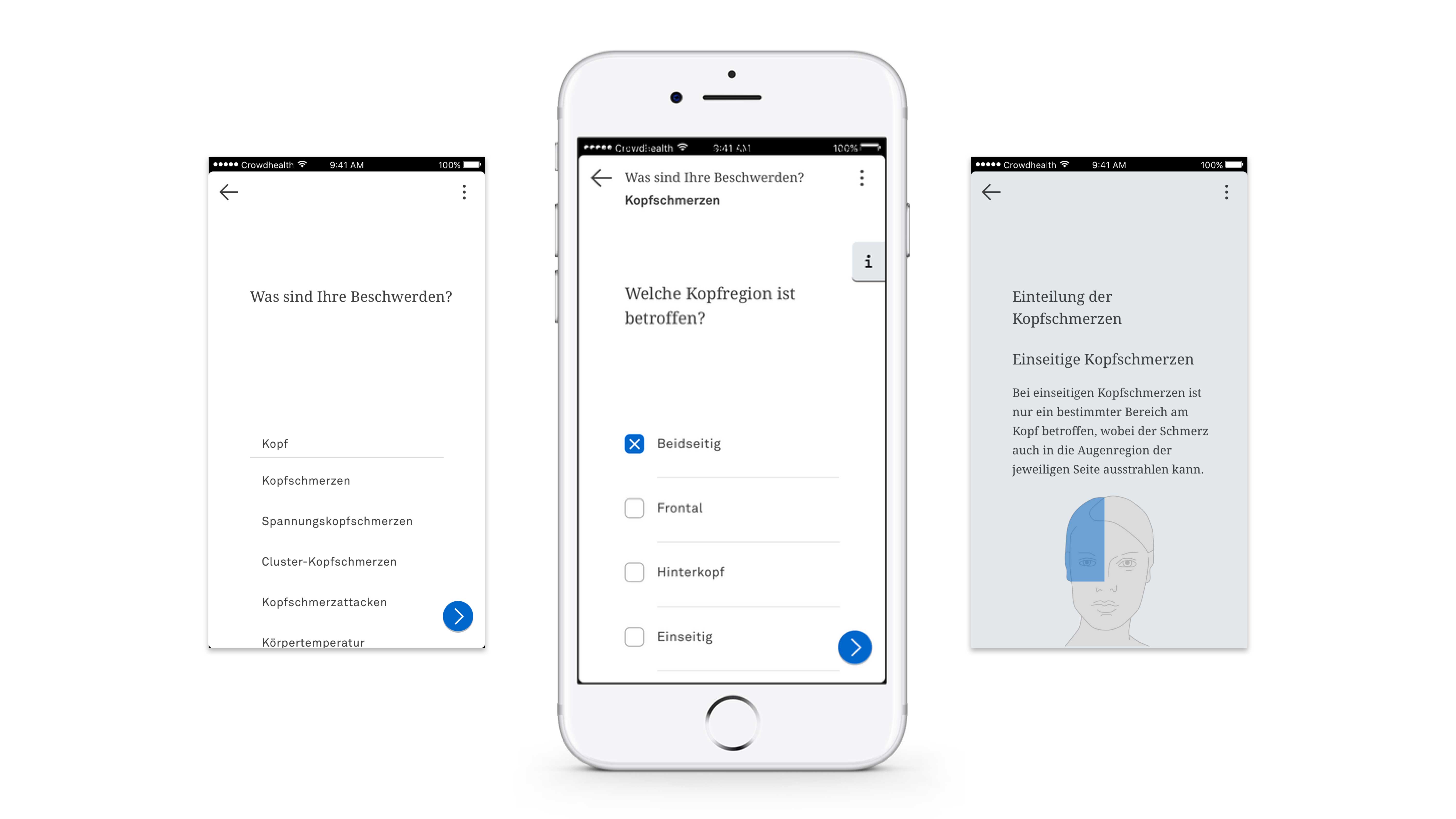 Die »Minimum Viable Products« haben uns im Verlauf unseres Prozesses jedes Mal geholfen, Verständnisfehler zu beheben. Im ständigen Austausch mit anderen Studenten und einem User Test mit einem medizinischen Experten konnten wir die Navigation und die Darstellung kontinuierlich überarbeiten und verbessern.