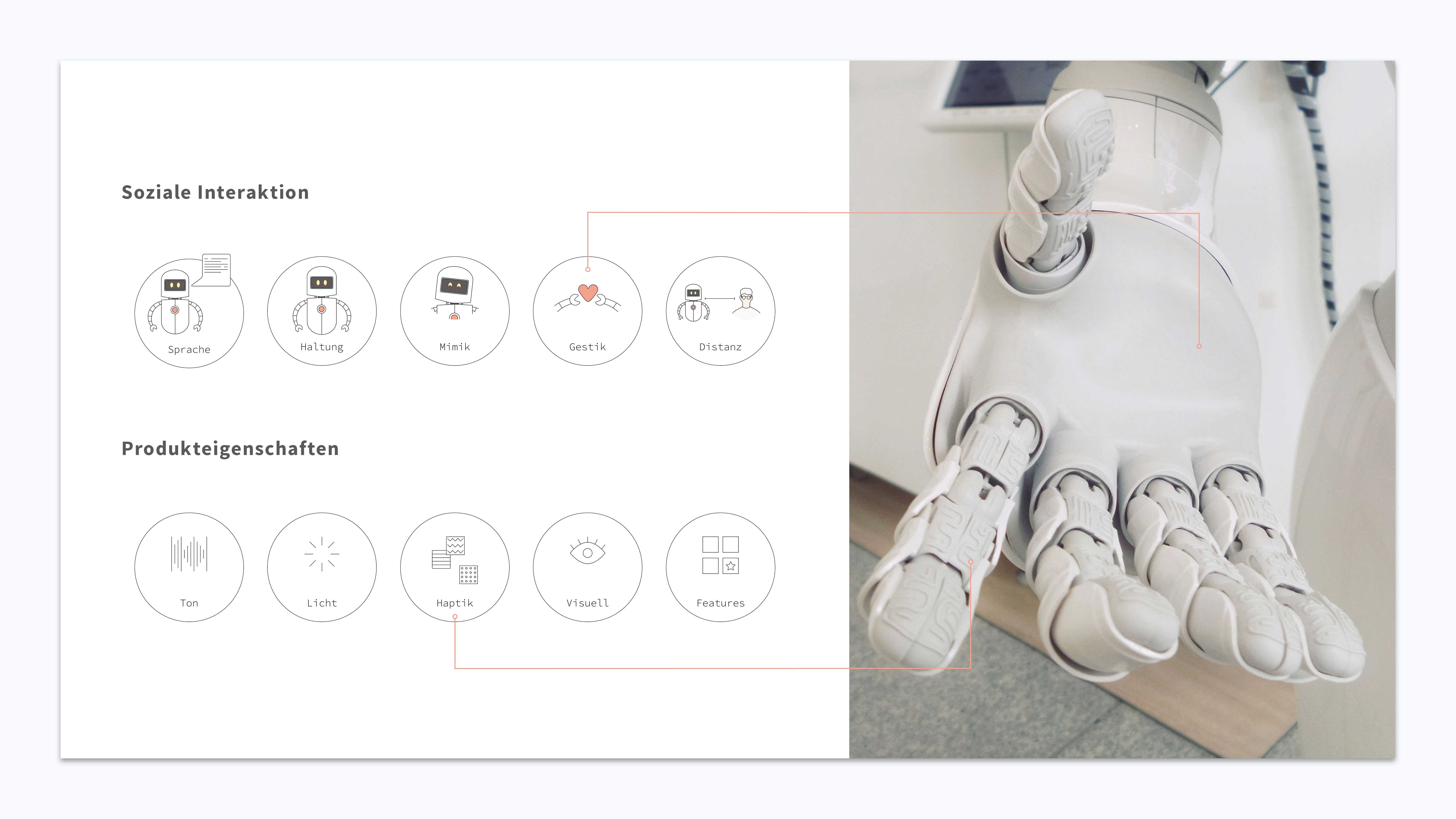 Mithilfe der drei Robotertypen und den Robotercharakteren aus der Filmografie wurden verschiedene Modalitäten erfasst. Modalitäten, die übergreifend für alle drei Robotertypen verwendet werden können wurden als »universelle Modalitäten« definiert und in einem Baukasten festgehalten, damit auch nach der Master-Thesis darauf zurückgegriffen werden kann. Der Baukasten unterscheidet in Modalitäten der sozialen Interaktion, wie zum Beispiel Sprache und nonverbales Verhalten, als auch in Produkteigenschaften, wie zum Beispiel Licht und Ton. Die aktuellen Interaktionsfähigkeiten, die die Roboter zurzeit aufweisen, wurden als »Ist-Modalitäten« festgehalten und in einem weiteren Schritt in die Zukunft skaliert, um dem technischen Fortschritt gerecht zu werden. Gearbeitet wurde sowohl mit den in der Zukunft liegenden Modalitäten, als auch mit den Modalitäten, die sofort umgesetzt werden können.