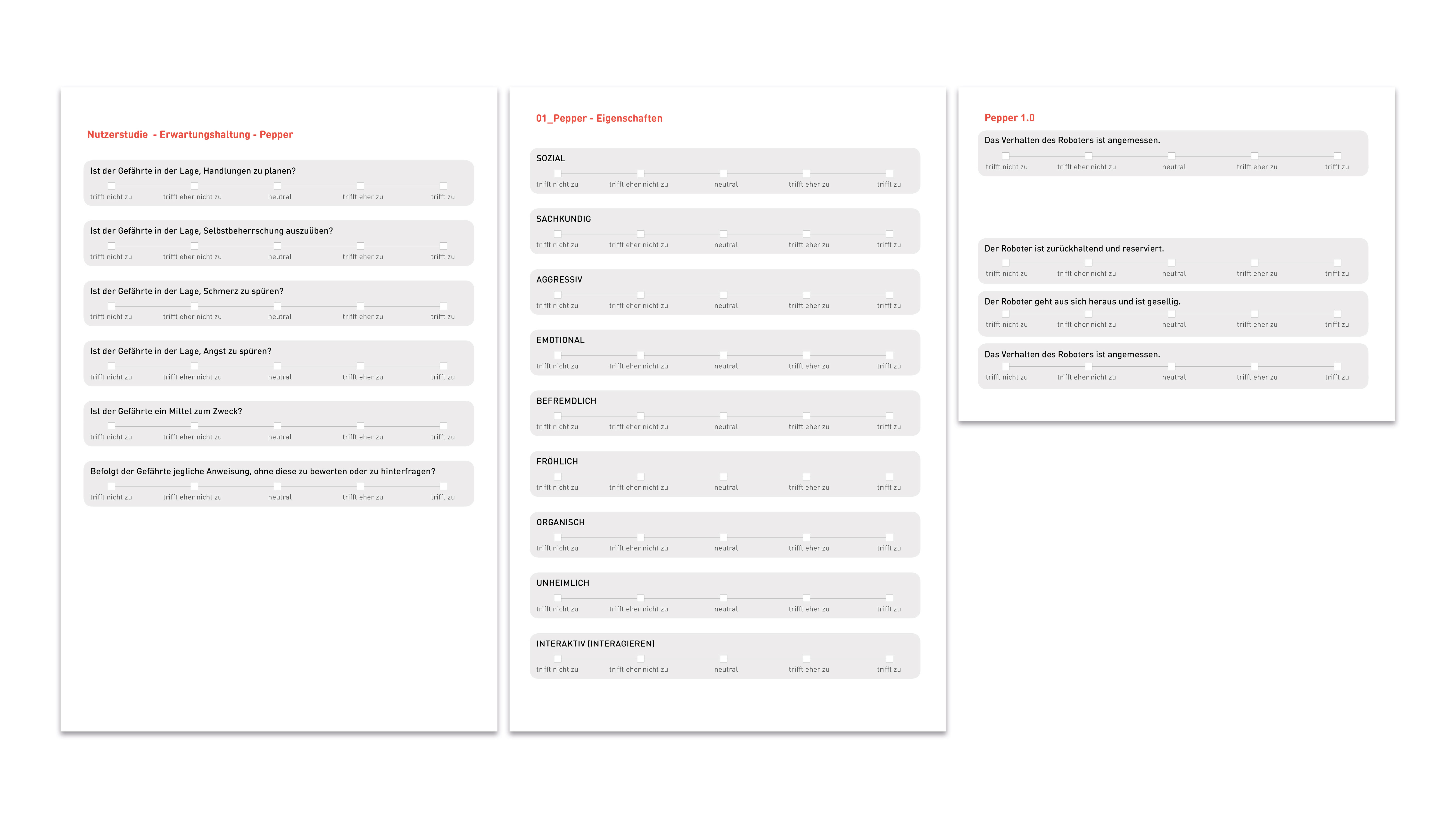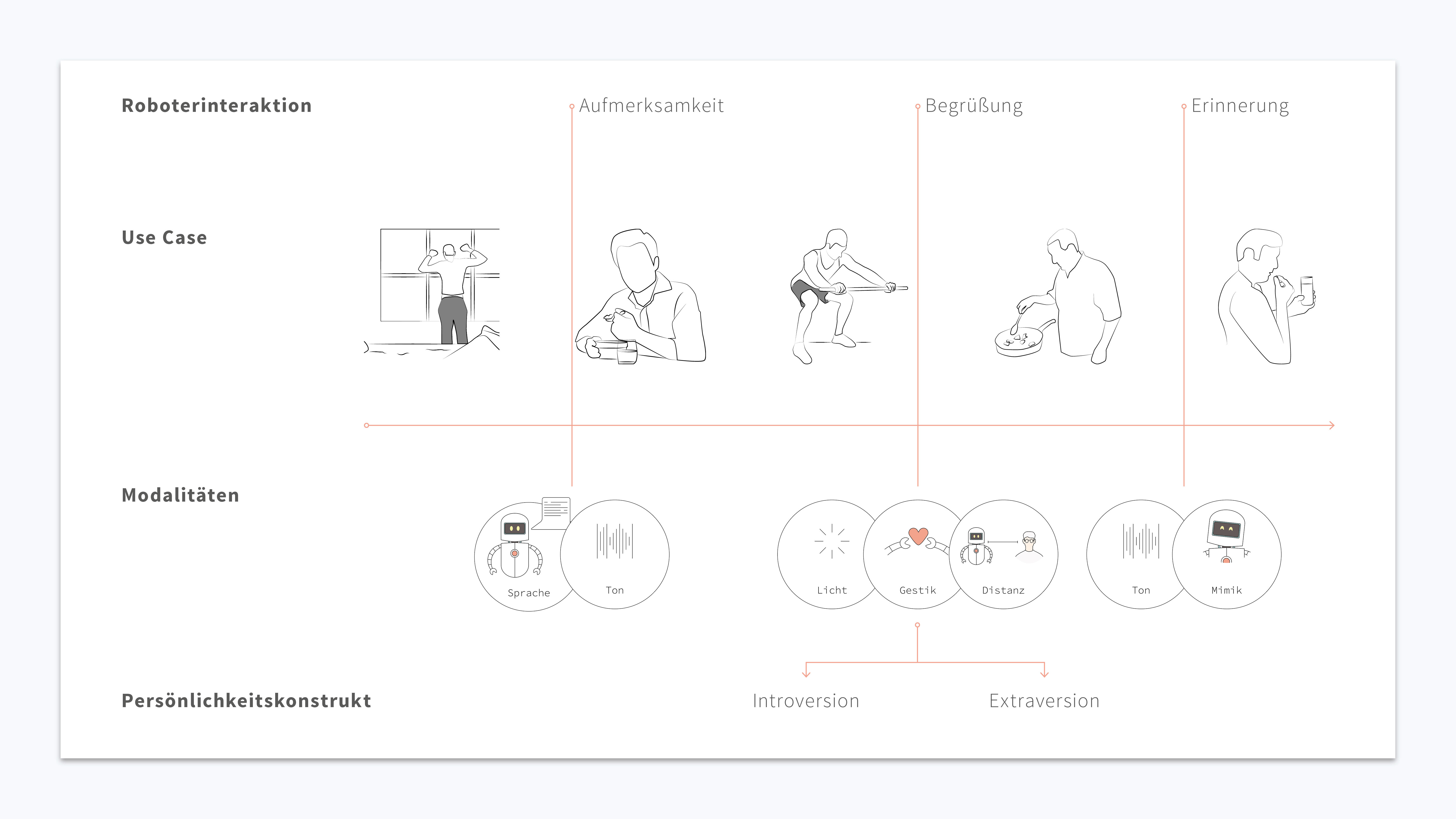 Für diese Erprobung konzentrierte sich die Studie auf drei verschiedene Robotiktypen. Den humanoiden Roboter »Pepper« (SoftBank Robotics), den animoiden Roboter »MiRo« (Consequential Robotics) und eine abstrakte Variante, den Staubsaugerroboter »Neato Botvac D85« (Neato Robotics). Die Interaktionsstrategien wurden in Form verschiedener Modalitäten (wie z.B. Sprache, Blick, nonverbales Verhalten, Farbe, Licht, Ton) festgehalten und exemplarisch in Sketches oder Animationen visualisiert und angewendet. Dabei fokussierten sich die Use Cases auf die Kernbereiche, der Gesundheits- und Alltagsunterstützung. Innerhalb einer qualitativen Nutzerstudie wurden die einzelnen Strategien auf ihre Akzeptanz evaluiert. Basierend auf den Ergebnissen der Nutzerstudie entstanden Empfehlungen für die zukünftige Gestaltung einer sozial, akzeptierten Mensch-Roboter-Interaktion.