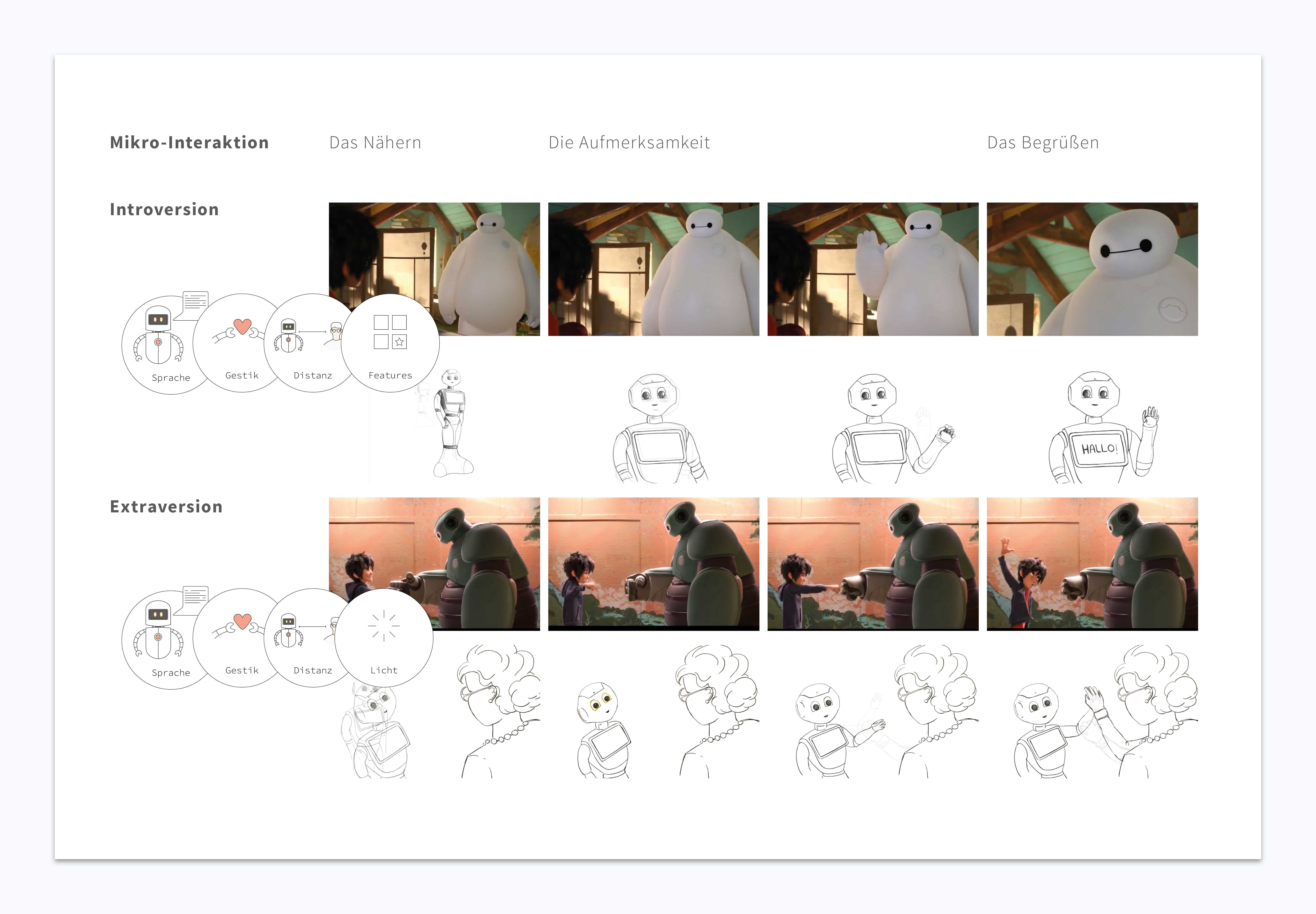 Im Folgenden dazu eine abstrahierte Version der Herleitung der Interaktionen und der Umsetzung der Modalitäten im Use Case des Begrüßens. Die Interaktionsanalyse geschah in diesem Fall mithilfe von Disneys humanoiden Roboter »Baymax«.