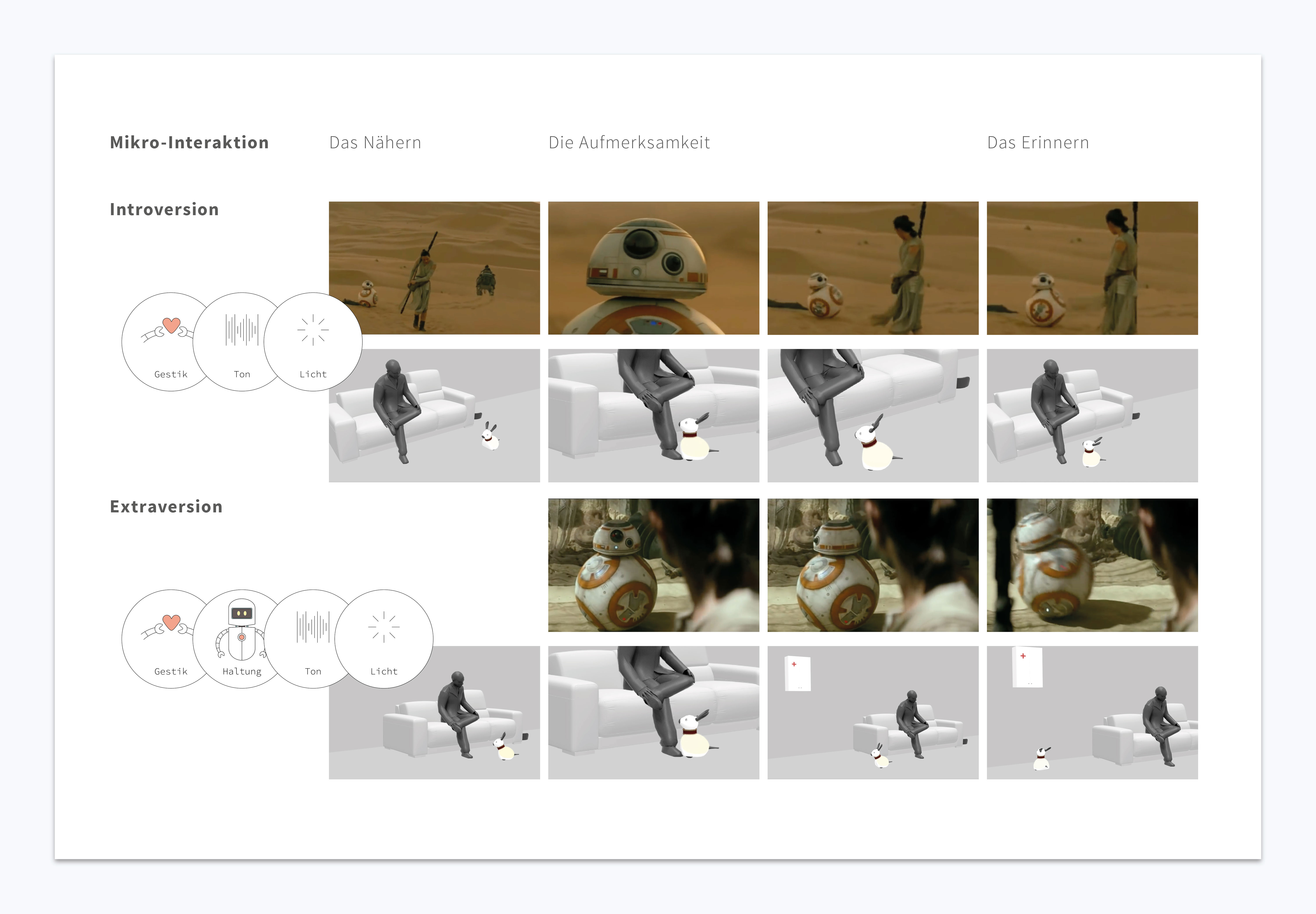 Wie bereits ersichtlich wurde, können durch die Abstraktion der »Essential Interactions« unterschiedliche Robotertypen als Inspirationsquelle dienen und bespielt werden. In diesem Fall kann vom abstrakten Roboter »BB8« das Verhalten auf den animoiden Roboter »MiRo« übertragen werden. Für die Übertragung dieser Interaktionen wurde nun im Folgenden die Strategie abstrahiert.