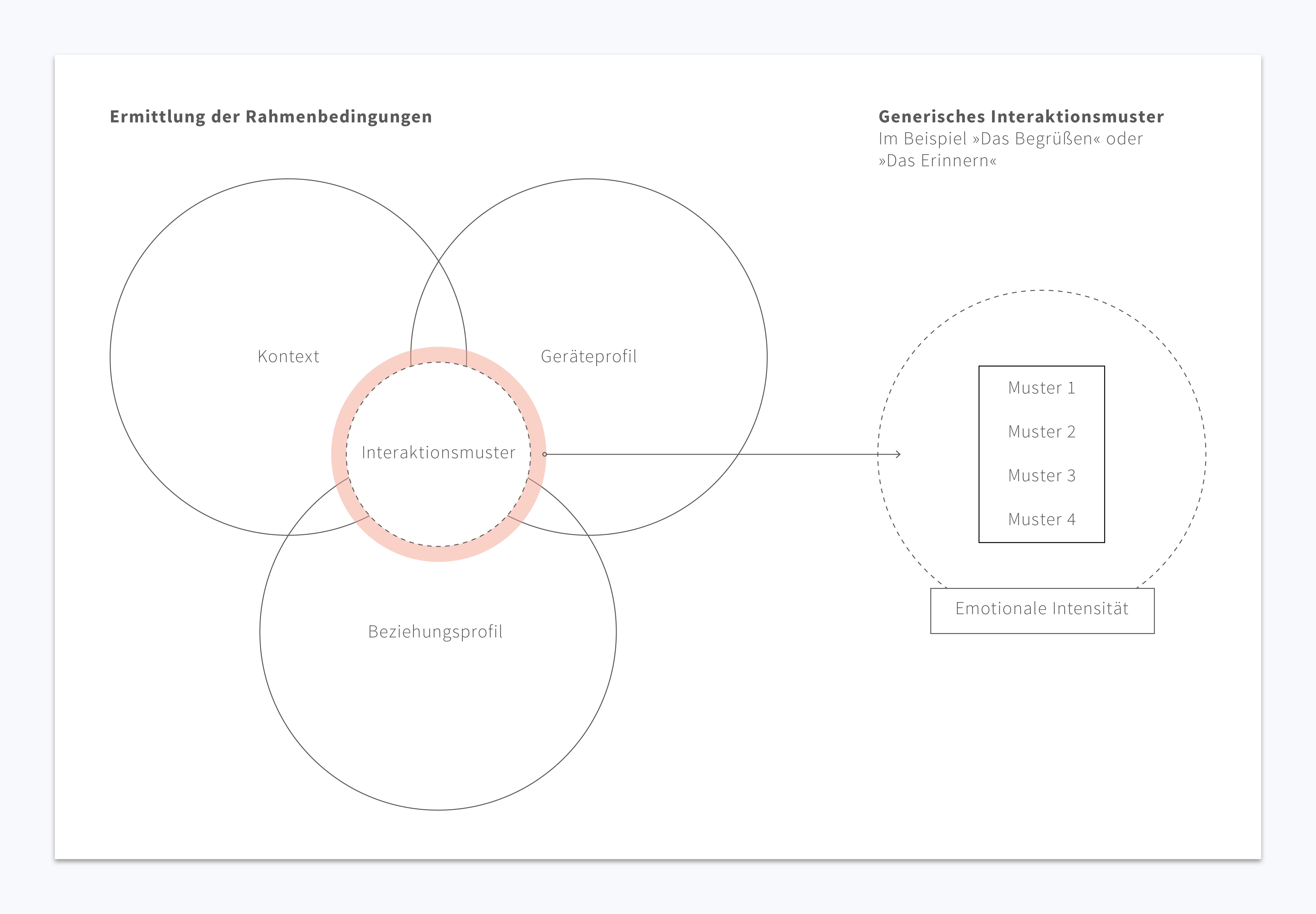 Die Grundlage bildet der Kontext, also in welcher Umgebung befindet sich der Roboter. Das Geräteprofil bestimmt die Modalitäten des Roboters, im Beispiel gehört »Baymax« der humanoiden Form an. Das Beziehungsprofil bestimmt wie lange sich Nutzer und Roboter bereits kennen und in welcher Beziehung die beiden zueinander stehen. Auf Basis der Rahmenbedingungen wird durch einen Auslöser, welcher im Kontext geschieht, ein generisches Interaktionsmuster beim Roboter ausgelöst.