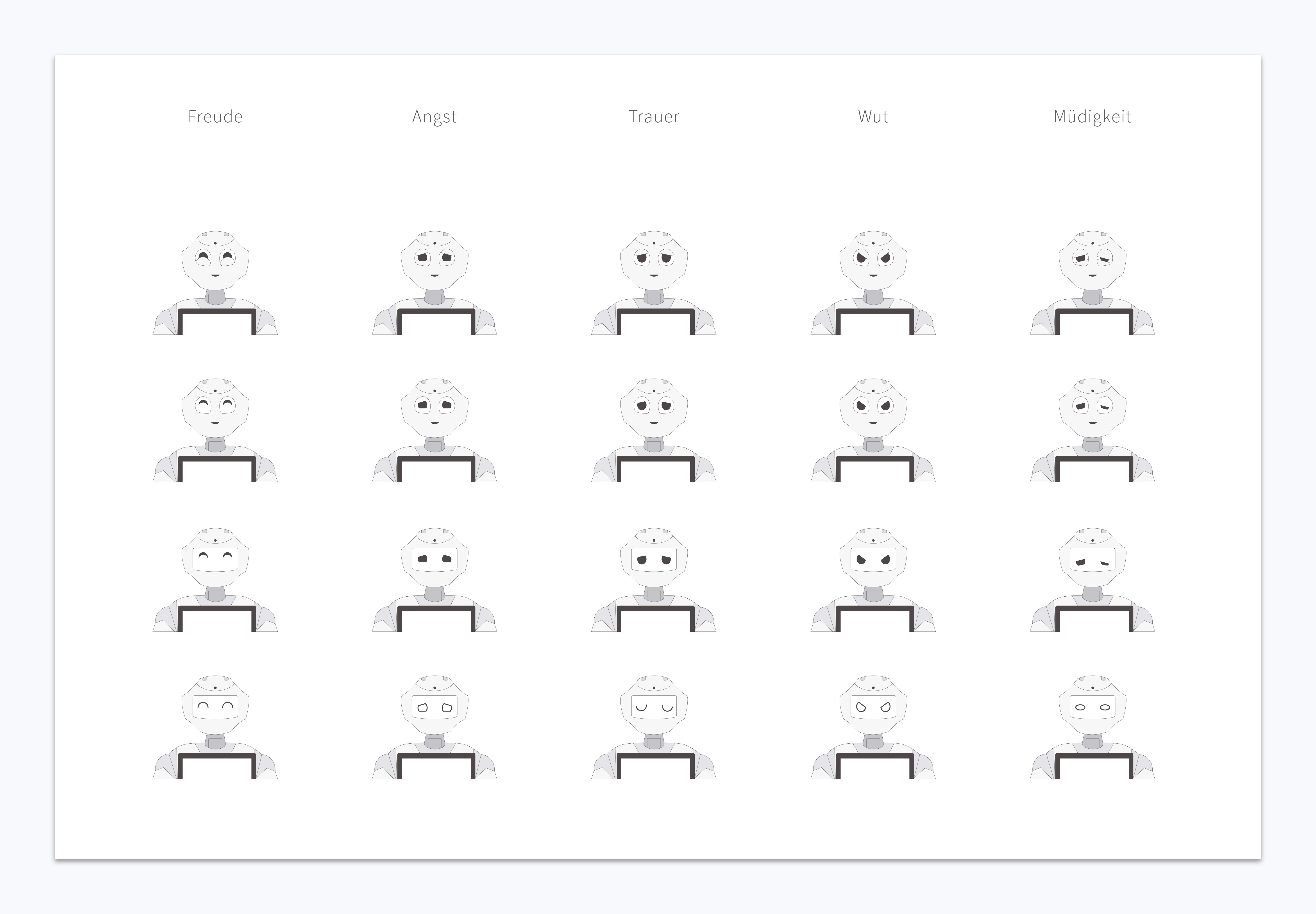 Um verschiedene Gesichtsausdrücke bei »Pepper« visualisieren zu können, wurden das »Facial Action Coding System« von Paul Ekman verwendet. Im Beispiel sind universelle Emotionen wie Ärger, Traurigkeit, Angst und Freude dargestellt, dabei wurden unterschiedliche Bespielungsmöglichkeiten ausprobiert, wie z. B. Augenlider oder ein Display als Gesicht. »Pepper« kann momentan nur einen Gesichtsausdruck darstellen. Möglicherweise reicht dieser für sein aktuelles Einsatzgebiet am Empfangstresen und auf Messen aus, allerdings könnte dieser Gesichtsausdruck im häuslichen Umfeld schnell langweilig oder sogar angsteinflößend wirken.