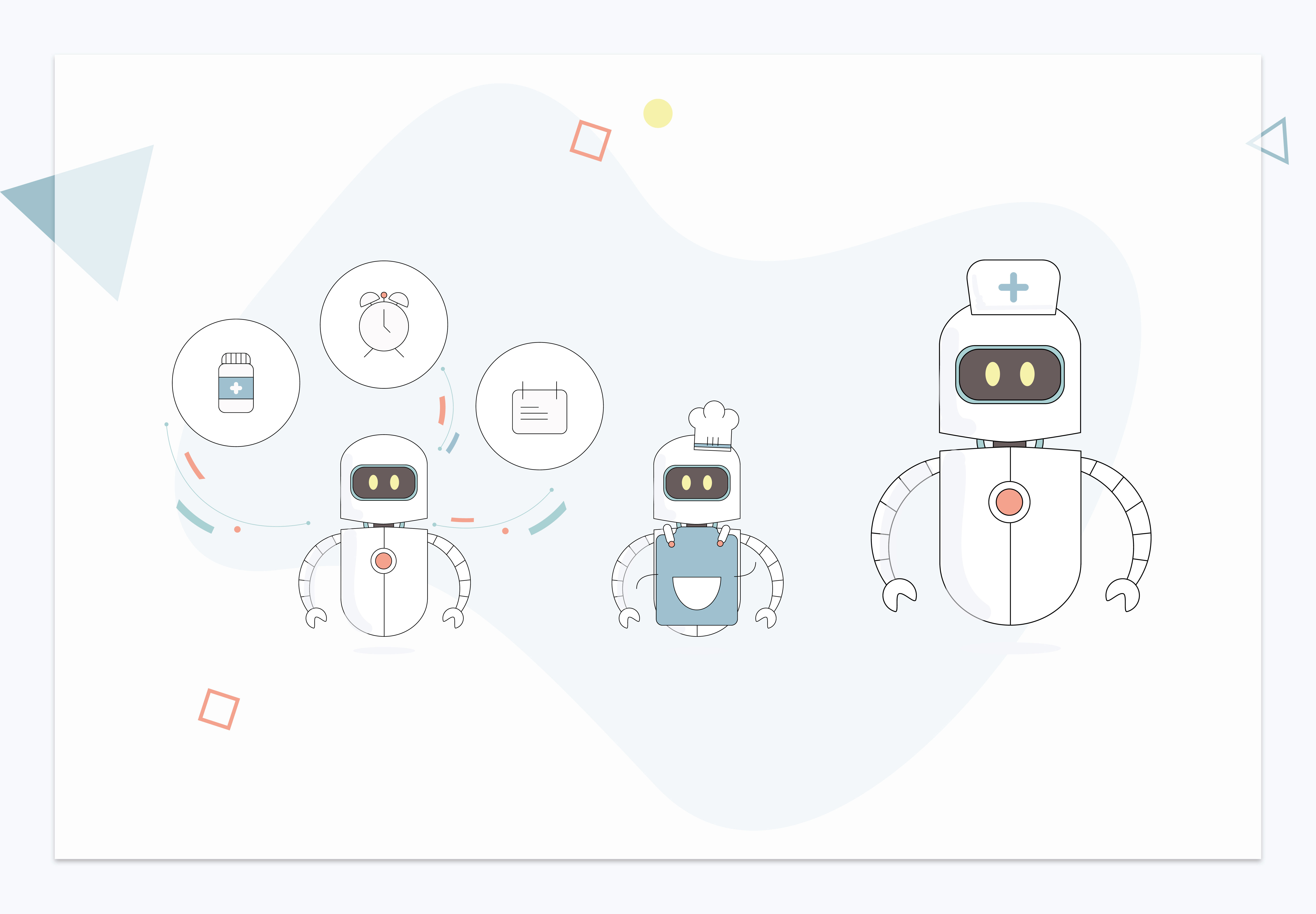 Die »Essential Interaction« des Erinnerns. Im Beispiel soll »Pepper« auf die Medikamenteneinnahme aufmerksam machen. Die Varianten unterscheiden sich in einem introvertierten und einem extrovertierten Verhalten. Die Interaktion wurde von »Baymax« und »BB8« adaptiert.